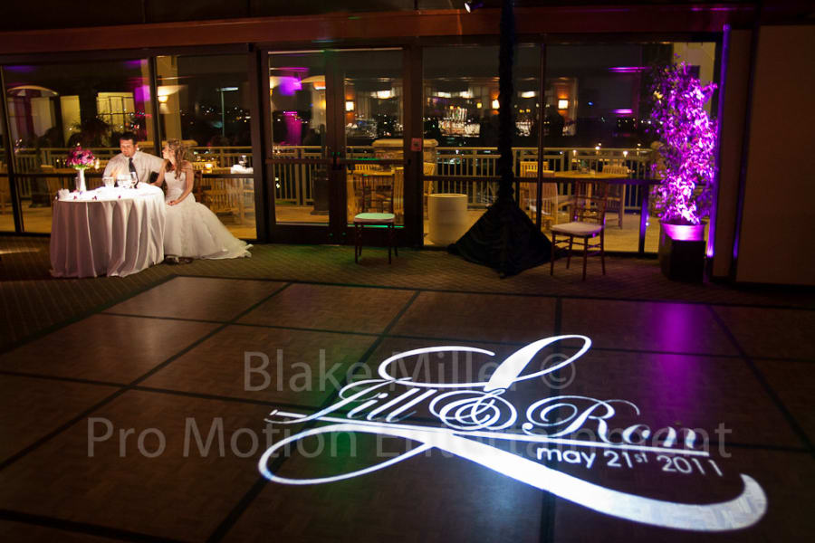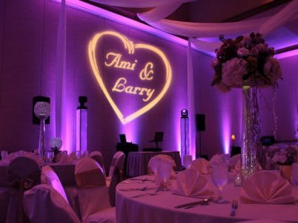 We create your gobo monogram, deliver, set up and run power to the projector. We include an